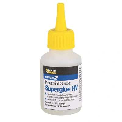 General description Everbuild Industrial Superglue HV is a high-viscosity, fast-setting adhesive based on advanced cyanoacrylate technology, designed for industrial applications. It is suitable for bonding various materials including MDF, rubber, metals, PVCu, and plastics. Technical specifications Size: 50g Viscosity at 25°C: 1500 cps Set time: 10 to 30 seconds Solvent-free Compatibility and accessories Compatible with MDF, rubber, metals, PVCu, and plastics Can be used with EVBPVCACT activator to enhance adhesion and speed up curing Installation Apply a small amount of glue to one surface Press surfaces together within 10-30 seconds for bonding Allow to cure fully before handling Usage Ideal for industrial bonding applications Fills gaps up to 0.25mm for secure adhesion Use with activator for faster results and increased strength