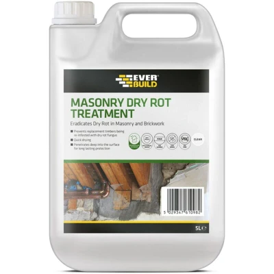 General description Everbuild Masonry Dry Rot Treatment is a ready-to-use solution designed for the eradication of dry rot in masonry and brickwork. The treatment features added biocide to help protect against re-infestation, ensuring long-lasting effectiveness. Its micro fine actives penetrate deep into the wood for thorough treatment. Technical specifications Volume: 5 litres Formulation: Low solvent, low odour, low VOC