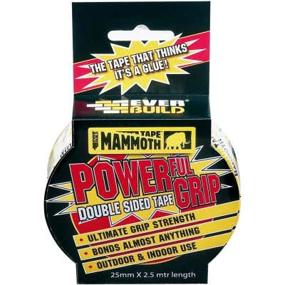 General description This Everbuild 25mm Mammoth Extra-Strong Double-Sided Tape is a heavy-duty adhesive tape designed for bonding various materials together. It features a polyester fabric reinforcement and a strong synthetic rubber/resin adhesive, providing high bond strength suitable for both indoor and outdoor use. When applied correctly, it is weatherproof and ensures a reliable hold on surfaces such as ceramics, wood, glass, plastics, brickwork, and PVC. Technical specifications Length: 2.5 meters Width: 25 millimeters Type: Double-sided tape Compatibility and accessories Suitable for bonding ceramics Wood Glass Plastics Brickwork PVC Other porous or non-porous surfaces Installation Ensure surfaces are clean, dry, and free of dust or grease before applying the tape Cut the desired length of tape and apply firmly to one surface Press the second surface onto the tape to ensure a strong bond Usage Ideal for mounting, bonding, or fixing objects where a strong, weatherproof adhesive