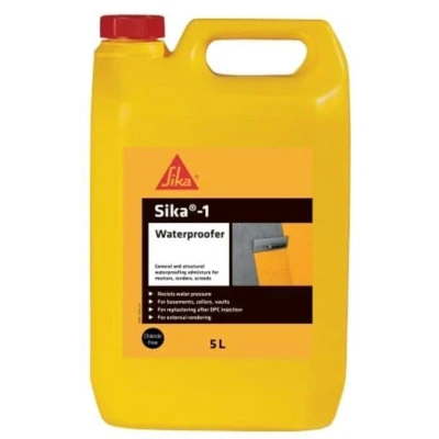 General description Everbuild Sika-1 Waterproofer is an aqueous solution containing complex colloidal silicates. When in contact with water, these silicates swell and effectively block the capillaries and pores in applied sand/cement renders, screeds, and mortar, creating a reliable barrier against liquid water transmission. Technical specifications Size: 5 litre