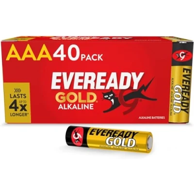 Amazon MarketplaceEveready Gold Alkaline AAA Batteries 40 pack Long-life AAA batteries: Hold in toys up to x4 longer than Eveready Super Heavy Duty Reliable energy: Long-life AAA batteries (LR03) for everyday devices such as watches, radios and toys Safe storage: Can be stored and used for up to 10 years - Secure your handy power supply with the AAA battery bulk pack Proven quality: Triple-A batteries are Quality Seal for Trusted Power rated and provide up to 2 years of leak protection for fully discharged batteries in equipment Ecological responsibility: AAA alkaline batteries do not contain mercury or cadmium Excellent price-performance ratio: Ensure all-round performance with this 40-pack of AAA batteries at a great price