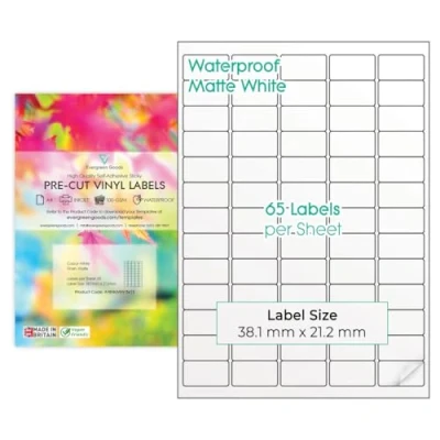 10 Sheets of A4 blank white fully customisable waterproof coated matte vinyl - made from quality PVC material Full A4 size: 210mm x 297mm with 65 labels (5x13) on each sheet, label size 38.1mm x 21.2mm, 650 labels in total. Compatible with Inkjet printers - works with all popular brand printers Strong permanent sticky back self-adhesive, great for high resolution sticker printing. Multi-purpose labels ideal for: name tags, mailing, product labelling, occasions, organisational purposes, crafting / scrap-booking, planners, sticker making, professional labels