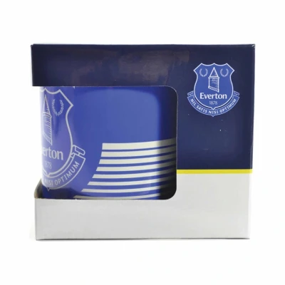 Everton FC Linea Mug. Ceramic everyday coffee mug. Blue and white linea design featuring a large Everton club crest. Glazed kiln fired finish with white handle. Official licensed product. Size: Approx 9cm tall, 8cm in diameter | Volume: Approx 315ml (11oz) | Packaging: In a printed card box