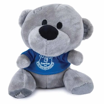 Soft to touch grey plush bear With stitched features and blue t-shirt with a white Everton crest 100% polyester Approx 14cm tall