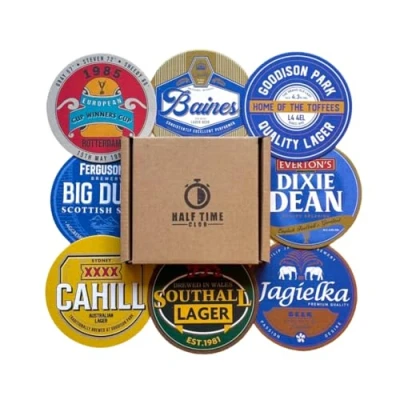BUNDLE OF 8 - A must-have for any Everton fan! Get 8 Everton inspired beer mats - perfect for displaying your support for the team at any party or gathering. Show your allegiance with The Toffees with these EFC themed beer mats. PERFECT PRESENT - Surprise your favourite Everton fan with these Beer Mat Coasters! A unique and thoughtful gift they'll love. Making a great stocking filler. GIFT PACKAGED - Arriving in a premium gift box ensuring your beer mats come in perfect condition, hassle-free. PREMIUM PULPBOARD - This beer mat set is made of a durable, high-quality, thick, absorbent pulpboard that'll make any footy fan proud. Perfect for keeping your drinks and tables safe. UNIQUE DESIGNS - Indulge in a relaxed and nostalgic vibe as you enjoy your favourite drink, surrounded by the iconic players, club songs, and historic moments that define the team's legacy.