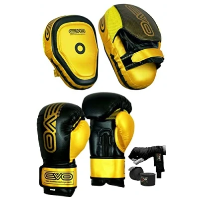 EVO Fitness Matte Boxing pads and Gloves Set Target Focus Mitts Hook Jab Training Sparring MMA Martial Arts Muay Thai Kickboxing Karate (Black/Golden, Deal with 10oz Gloves)