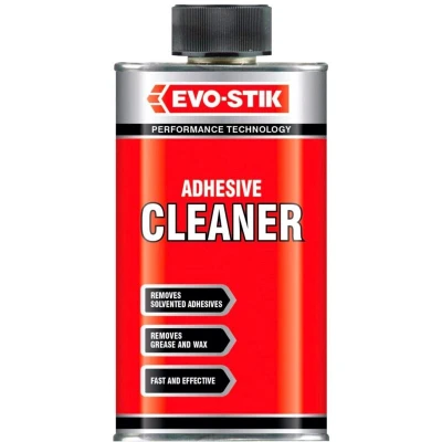 General description This adhesive cleaner from Evo-Stik is designed to quickly and effectively remove residue from solvent-based adhesives. It works on both wet and dry adhesives, making it suitable for various applications. The product can also remove grease, wax, and similar stains, helping to clean surfaces thoroughly. Technical specifications Volume: 250ml Color: Clear Suitable for: Adhesive residues, grease, wax, and stains Application: Internal and external use Type: Adhesive cleaner Compatibility and accessories Not suitable for use on polystyrene, cellulose paint, vinyl, and rayon fabrics Installation Apply the cleaner directly onto the adhesive residue or stain Use a cloth or sponge to wipe the area clean Repeat if necessary for stubborn residues Usage Ensure the surface is dry and free of dust before application Spray or apply the cleaner onto the affected area Wipe with a clean cloth to remove residue Use in well-ventilated areas