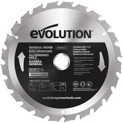 General description Evolution 185mm 24 tooth Tungsten Carbide Tipped blade is designed for wood cutting, compatible with Evolution mitre saws and table saws. These saw blades are engineered for maximum performance using high-grade carbide, hardened blade bodies, and ultra high-grade brazing techniques, ensuring premium quality to enhance production and performance. Technical specifications Diameter: 185mm Max Speed: 5800rpm Bore: 20mm Kerf: 2.4mm Teeth: 24 Compatibility and accessories Compatible with R185SMS - 185mm Mitre Saw Compatible with R185SMS+ - 185mm Mitre Saw Can be reversed and used with EVOSAW180HD - 180mm Circular Saw Compatible with S185CCSL - 185mm Circular Saw Installation The blade can be reversed (blade print facing inwards towards tool) to ensure correct tooth orientation when used with a circular saw or chop saw.