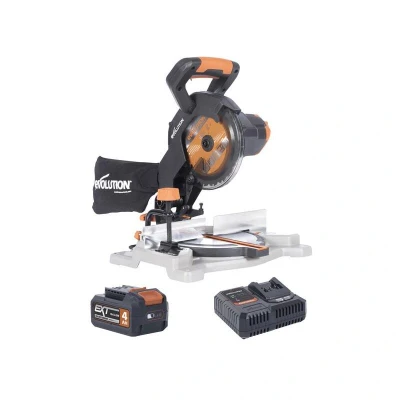 Evolution Power Tools R185CMS Li Cordless Mitre Saw Multi Material Cutting, Cuts Wood with Nails, Metal, Plastic & More, Bevel Angles, TCT Blade Included Battery Charger
