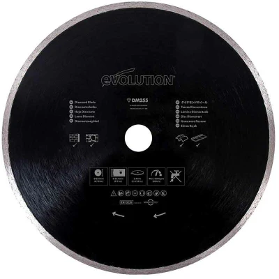 General description This Evolution 255mm continuous rim diamond blade is specifically designed for cutting masonry and tile with your Evolution Mitre Saw. Its continuous rim makes it ideal for cutting glazed tile and porcelain, providing a smooth cutting performance. Technical specifications Diameter: 255mm Bore diameter: 25.4mm Kerf: 2.4mm Maximum speed: 6,150 rpm Type: Continuous Rim Compatibility and accessories Compatible with R255SMS - 255mm Mitre Saw Compatible with R255SMS+ - 255mm Mitre Saw Compatible with R255SMS-DB - 255mm Mitre Saw Compatible with R255SMS-DB+ - 255mm Mitre Saw Compatible with R255MTS - 255mm Mitre/Table Saw Compatible with RAGE3 - 255mm Mitre Saw Compatible with RAGE3-DB - 255mm Mitre Saw Installation Install the blade securely onto the saw's arbor following the manufacturer's instructions. Usage Use for cutting masonry, tile, stone, concrete, roof tiles, and slate with precision. Ensure the saw is turned off before changing blades. Other information Not