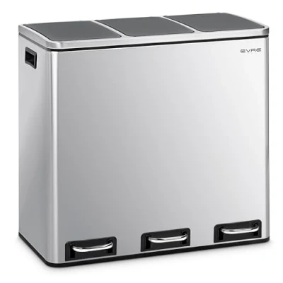 ManoManoGeneral description The Evre Stainless Steel Recycling Pedal Bin is designed for efficient waste management in kitchens, bathrooms, or offices. With a total capacity of 54L divided into three 18L compartments, this stylish bin offers a practical solution for sorting general waste. Its rectangular shape and modern design make it a perfect fit for any space. Technical specifications Dimensions (LxWxH): 61 x 35.5 x 56 cm Total capacity: 54L (3 compartments of 18L each) Installation No installation required; simply place the bin in your desired location. Usage Easy to use with a lift, tie, and dispose mechanism. Features removable inner bin compartments for convenient emptying. Soft close lid for quiet waste disposal. Other information Smudge-resistant and fingerprint-proof stainless-steel finish for easy cleaning. Non-slip base for stability. Ergonomically designed lids to seal odors effectively. Backed by EVRE customer service for assistance.