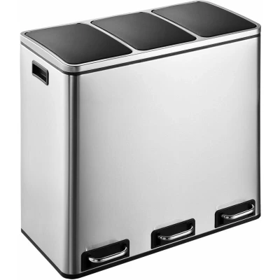 General description The Evre Stainless Steel Recycling Pedal Bin is designed for efficient waste management in kitchens, bathrooms, or offices. With a total capacity of 54L divided into three 18L compartments, this stylish bin offers a practical solution for sorting general waste. Its rectangular shape and modern design make it a perfect fit for any space. Technical specifications Dimensions (LxWxH): 61 x 35.5 x 56 cm Total capacity: 54L (3 compartments of 18L each) Installation No installation required; simply place the bin in your desired location. Usage Easy to use with a lift, tie, and dispose mechanism. Features removable inner bin compartments for convenient emptying. Soft close lid for quiet waste disposal. Other information Smudge-resistant and fingerprint-proof stainless-steel finish for easy cleaning. Non-slip base for stability. Ergonomically designed lids to seal odors effectively. Backed by EVRE customer service for assistance.