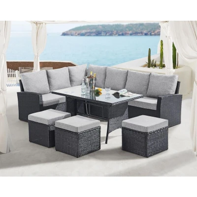 General description Transform your outdoor space into a stylish and inviting haven with the Marylin rattan garden dining set. This set features a spacious corner sofa and 3 stools that accommodate up to 9 people, complemented by 8-10cm thick luxurious cushions for a memorable soiree. The included 5mm glass-topped table is perfect for hot meals and can also serve as a functional workspace, thanks to its shatter-proof, anti-glare, and heat-resistant design. The durable metal frame is encased in handwoven, recyclable PE rattan, ensuring long-lasting durability while promoting environmental friendliness. Its fade and UV-resistant properties guarantee longevity, making it an excellent addition to your indoor or outdoor space. Technical specifications Table dimensions: 64x130x70cm (HxWxD) 1st Sofa dimensions: 71x175x65cm (HxWxD) 2nd Sofa dimensions: 71x165.5x65cm (HxWxD) Stool dimensions: 34x45x45cm (HxWxD) Installation Flat pack in 3 boxes Quick assembly required between 2 people using the