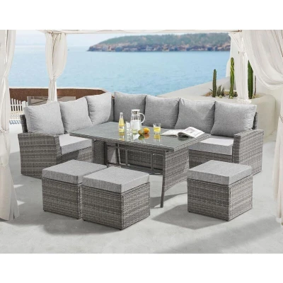 General description Transform your outdoor space into a stylish and inviting haven with the Marylin rattan garden dining set. This set features a spacious corner sofa and 3 stools that accommodate up to 9 people, complemented by 8-10cm thick luxurious cushions for a memorable soiree. The included 5mm glass-topped table is perfect for hot meals and can also serve as a functional workspace, boasting a shatter-proof, anti-glare, and heat-resistant design that enhances your outdoor experience. Technical specifications Table dimensions: 64x130x70cm (HxWxD) 1st Sofa dimensions: 71x175x65cm (HxWxD) 2nd Sofa dimensions: 71x165.5x65cm (HxWxD) Stool dimensions: 34x45x45cm (HxWxD) Installation Flat pack in 3 boxes Quick assembly required between 2 people using the provided pictorial instructions Usage Wipe-clean rattan for effortless maintenance Removable cushion covers can be hand washed for optimal enjoyment Keep cushions indoors and dry fully if wet Recommended to cover the set with a 600D