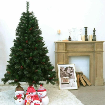 General description What better way to bring the experience of a warm and cozy log cabin into your home than with this luxurious pinecones and berries decorated Christmas Tree from EVRE. Made from high-quality PVC, it offers a natural and full appearance. Fully customizable, each tip can be individually extended and bent to achieve your preferred fullness. Perfect for creating a festive atmosphere in any room, retail, or office space. Technical specifications Height: 7 ft Material: High-quality PVC Decorations: Pinecones and berries Installation Easy to install, dismantle, and store. Assembly instructions are simple and straightforward. Remove the plastic caps from the bottom of the stems, place together, and tightly screw the stand. Extend the hinged branches to your desired look. Usage Adorn with Christmas lights, decorations, and a tree topper to complete the festive look. Use tinsels and LED lights to further enrich the presentation of your tree. Other information All four of the