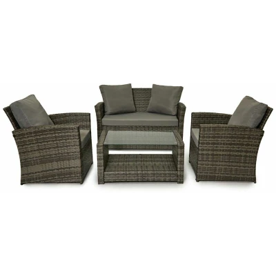 EVRE Grey 4 Seater Rattan Garden Conservatory Patio Furniture Sofa Armchair Roma Set with Glass Top Coffee Table Wicker Weave and Cushions