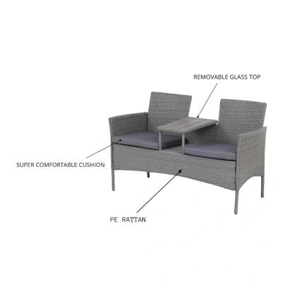 ManoManoGeneral description Reinvent your garden, patio, conservatory, outdoor balcony, or even your cafe with the Evre Lisbon Two-Seater Companion Bench. This set features two comfortable seats and a wood effect table in a smart, space-saving design, making it a must-have for small spaces. Technical specifications Overall dimensions: 84x133x65 cm (HxWxD) Seat dimensions: 40x47x48 cm (HxWxD) Maximum weight allowance: 220 kg Installation Furniture arrives flat-pack in 1 box and requires assembly. Assembly is easy with a full instruction manual provided. Usage Ideal for gardens, patios, conservatories, balconies, or cafes. Low maintenance; simply wipe down and dry. Removable cushion covers are dirt resistant, shower-proof, and can be gently hand washed. Extend the lifespan of your furniture by keeping it covered when not in use and storing cushions indoors. Other information Constructed with a robust powdered steel frame. Woven with PE rattan, which is UV resistant, durable, and recyclable.