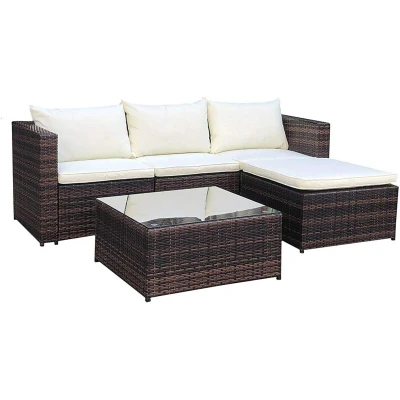 EVRE Malaga Brown Rattan Garden Outdoor Furniture Wicker Set 4 Seat Corner Sofa Couch Footstool Glass Top Table with Cushions for Patios Conservatories Gardens