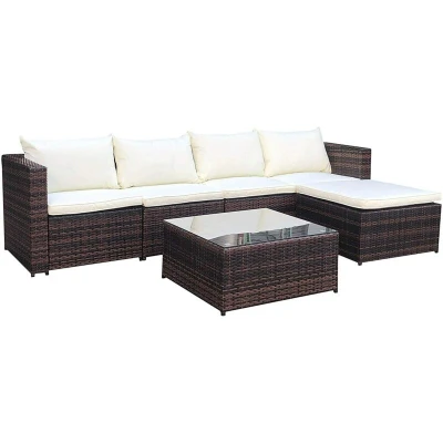 EVRE Miami Brown Outdoor Rattan Garden Furniture Set for Patio Conservatories with 5 seat Modular Sofa Glass Top Coffee Table Foot Stool Cushions and Fade Resistance