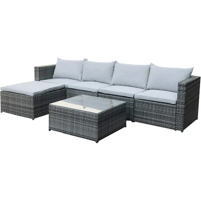 EVRE Miami Grey Rattan Outdoor Garden Furniture Set, Corner Sofa, Glass Coffee Table Foot Stool and Cushions for Patios Conservatories Indoor Seating Dining