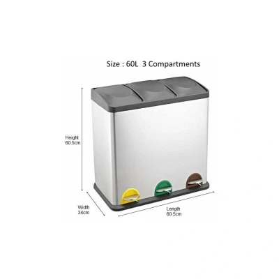 ManoManoGeneral description The Evre Recycling Bin is a stylish and practical solution for waste separation in your kitchen, bathroom, or office. With a total capacity of 60 litres divided into three spacious 20-litre compartments, this cube-shaped stainless-steel bin is designed for convenience and efficiency. Its colour-coded pedals help organize waste into food, recycling, and garden categories, making disposal easy and efficient. Technical specifications Capacity: 60 litres (3 compartments of 20 litres each) Dimensions (LxWxH): 59 x 33 x 65 cm Usage Lift, tie, and dispose of waste effortlessly. Use the colour-coordinated pedals for easy organization of different waste types. The ergonomically designed flaps seal shut to keep unwanted odours contained. Other information Smudge-resistant and fingerprint-proof stainless-steel finish for easy cleaning. Non-slip base for stability during use. Easy-to-remove inner bin compartments for hassle-free emptying. Backed by friendly customer service
