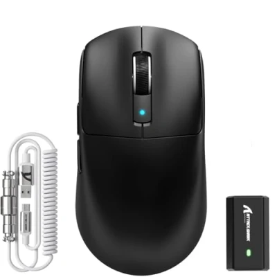 ADVANCED MCU--NORDIC 52840: Adopt the latest flagship Nordic 52840 main control chip - long distance, high transmission speed mode. 1M flash memory and 256KB memory, it provides sufficient memory for flash memory and RAM, which are necessary conditions for demanding applications. This Attack Shark R6 wireless gaming mouse is truly a game changer. TOP PAW3950 SENSOR: With PAW3950 optical sensor, up to 42000 DPI resolution, 650 IPS tracking speed, 50G acceleration, excellent accuracy can capture the tiny movements of the mouse. It is designed for gamers and uses cutting-edge 8K polling rate technology(in 2.4GHz mode) for lightning-fast response speed and precision. 39G SUPERLIGHT GAMING MOUSE: Net weight is only 39±3g. Adopting innovative internal skeleton design, thin and sturdy shell. Provide more flexible movement and better control for fierce game battlefield. The ice-feel coating process of the shell greatly improves the comfort of hand feel and conforms to the perfect ergonomic structure. THREE CONNECTION MODES: Supporting wired + 2.4GHz + Bluetooth connection, its three modes provide flexibility for any game setting and meet various user needs. Its optical mouse switch supports 80 million clicks, which is more than 3 times faster than the traditional switch response speed, satisfying players' pursuit of fast clicks without double-click phenomenon. FULL KEY PROGRAMMABLE: Supports cloud drive, no need to download driver software to achieve custom programming, including buttons, DPI settings, polling rate, etc. It is also equipped with a custom mouse cable, using high-quality aviation connectors to ensure excellent anti-oxidation and anti-interference capabilities. Even if used for a long time and frequently unplugged, it can ensure a stable connection.
