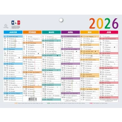 With the indication of school holidays, Sundays and public holidays are printed in full colour for easy location, space to write on each day. Front 6 months: January - June Verso 6 months: July - December The +s: accuracy of the saint of the day, the number of the week is clearly visible Ideal size for office or bag Certifications: PEFC (paper fibres from sustainably managed forests) - Green print (environmentally friendly printing) Born in the Vosges, made in France and designed for you
