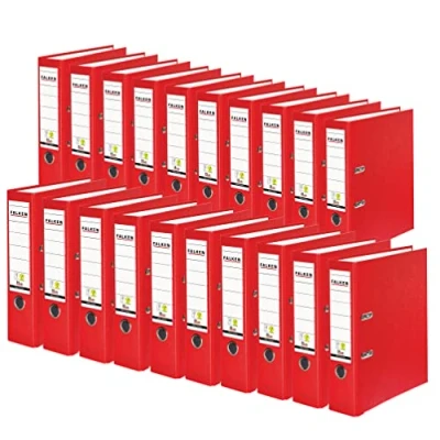 A4 in size and Red in colour Reinforced quality lever mechanism, exchangeable spine label, edge protection, finger hole, dirt and moisture-repellent PP film on the outside 8 cm spine. Can hold approximately 600 sheets (80 g) FSC certified and manufactured in Germany VEGAN certified - Guaranteed free of animal glue. Pack of 20