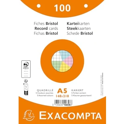 The Bristol of Exacompta cards is a Clairefontaine paper compatible with inkjet, laser and photocopier printers Packaging: in film per 100; the type of squared, plain, punched, printed, assorted colours can be easily identified thanks to the colour of the packaging Ruler: perforated 5 x 5 squared; Size: 148 x 210 mm; Assorted colours: azure, yellow, pink, green RIGID and practical, the Bristol cards allow multiple use and comfortable writing, they will perfectly suit your practical work, your note cards MANUFACTURING: 100% French, raw material and finished product come from the factories of the Exacompta-Clairefontaine Group; PEFC certification