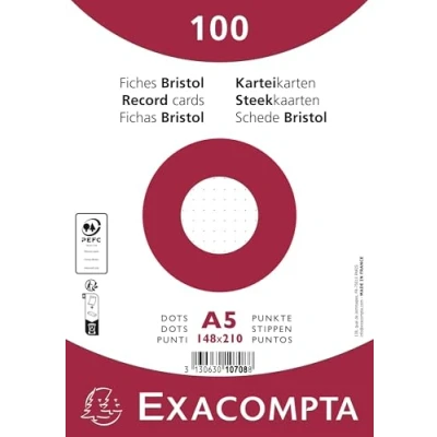 THE BRISTOL of the Exacompta cards is a Clairefontaine paper compatible with inkjet, laser and photocopier printers USE: the card can be used in vertical or horizontal directions for a wide variety of uses in school, office or at home Rigid and practical, these Bristol cards allow multiple use and comfortable writing, they will perfectly suit your practical work, note cards, messages, memos, learning cards, course summaries Ruling: between the grid for drawings, and the line for writing, the dots work for both; Format: 148 x 210 mm; Colour: white MANUFACTURING: 100% French, raw material and finished product come from the factories of the Exacompta-Clairefontaine Group; PEFC certification