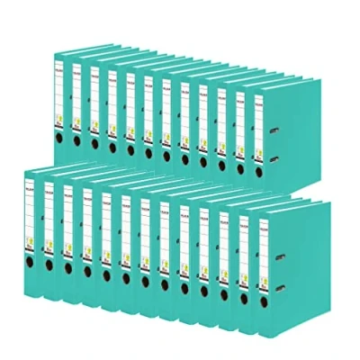 A4 in size and Turquoise in colour Reinforced quality lever mechanism, exchangeable spine label, edge protection, finger hole, dirt and moisture-repellent PP film on the outside 5cm spine. Can hold approximately 600 sheets (80g) FSC certified and manufactured in Germany VEGAN certified - Guaranteed free of animal glue. Pack of 25