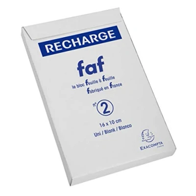 With its retro design, the FAF notebook is the ideal notebook to always have at your fingertips. Practical and functional, it stays securely in place on the desk thanks to its non-slip pads that stabilize it. Its micro-perforated sheets can be easily punched with one hand. plain refill paper Number of items: 1.0 Color: Recharges unies 16x10cm in size Can be used with FAF pad No.2 12112E