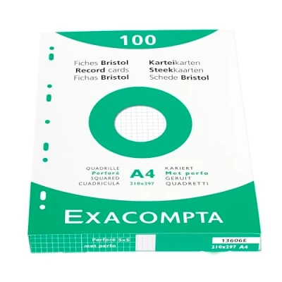 Exacompta Ref 13606E Bristol Squared Record Cards (Pack of 100) A4 in Size, 205gsm Card, Compatible with Printers Suitable for Exam Revision & Notes White