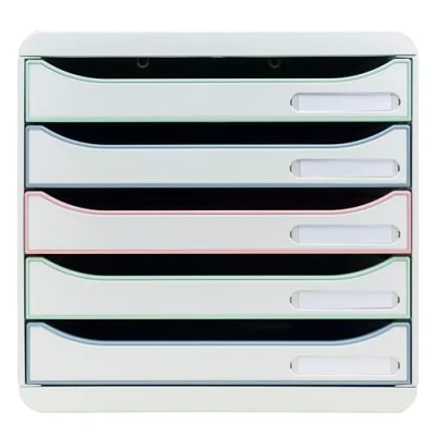 Individual box with 5 drawers for A4 and A4+ documents, plastic pockets 24 x 32 cm or large envelopes. The Autentik range combines design and eco-responsibility with a white plastic from waste - Certified Blue Angel One-piece, ultra-stiff. Made of high quality plastic. Stackable thanks to 4 reliefs provided for this purpose. - Open drawers allow direct entry of documents without opening them Perfect drawer runner, with safety stop, label holder and label set "Monday to Sunday" (supplied) DIMENSIONS: Depth 34.7 x Width 27.8 x Height 27.2 cm 25 year guarantee - Assorted colours: white, candy pink, sage, blue grey
