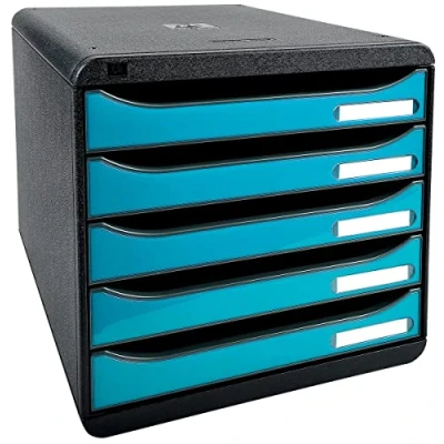 Exacompta Ref 3097282D BIG BOX PLUS Desktop Drawer Set 5 x 43mm Drawers, Suitable for A4+ Documents, 347 278 271mm, 100% Recycled Plastic Black/Glossy Turquoise