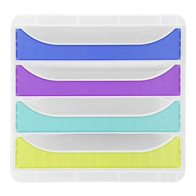 Individual cabinet with 4 drawers for A4+ documents and large envelopes. Innovative and attractive design. Single block, ultra-rigid. Open drawers allow direct insertion of documents without opening drawers. Drawer size: 4 x 55 mm Sliding and silent drawers equipped with safety stop Colour: crystal/translucent harlequin