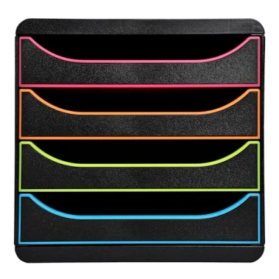 Exacompta Ref 310914D BIG BOX Desktop Drawer Set 4 x 55mm Drawers, Suitable for A4+ Documents, 347 278 267mm, 100% Recycled Plastic Black/Multi