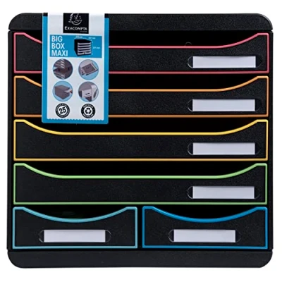 Drawer dividers: single black stackable box, 6 drawers, 4 drawers for A4 and A4+ documents, elastic pockets 24 x 32 cm or large envelopes and 2 drawers for storing all your small items Monoblock, ultra-rigid, overlappable by 4 reliefs provided. Can be placed on the scooter set to make it mobile. Ref. 326714D Exacompta Open drawers allow for direct insertion of documents without opening Drawers and quietly equipped with a safety stop and label holder with a set of labels from Monday to Sunday included Packaging and colour: sold individually, black / harlequin