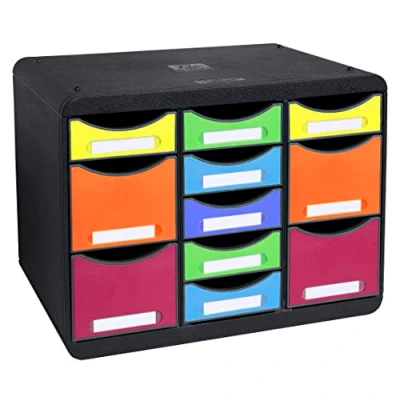 Individual black stackable cabinet with 11 drawers, 7 slim drawers and 4 high drawers to store all the utensils in the office. Innovative and attractive design One-piece, ultra-rigid, stackable thanks to 4 reliefs provided for this purpose. Can be placed on the roller set to make it mobile ref 326714D Exacompta – Italian format (landscape): ideal for shallow spaces (overall depth 27 cm) Perfect drawer runner, with safety stop, label holder and label set "Monday to Sunday" (supplied) DIMENSIONS: Depth 27 x Width 35.5 x Height 27.2 cm Colour: Harlequin – Blue Angel certified because made from post-consumer recycled plastic