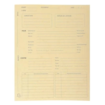 Procedural follow-up file specially designed for lawyers. Printed file to note the client's contact details, the progress of the procedure, etc... Format 25 x 32 cm for filing sub-folders 22 x 31 cm. The file of the proceedings shall be kept for each application lodged in court, at the registry of the court seized. This file contains all the elements of the case (findings and documents of the parties, letters sent by the judge, summons, minutes of hearings, etc.). It can in principle be consulted by the parties. ASSORTED COLORS: ivory, red, linden and turquoise