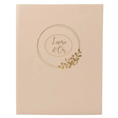 Due to its light tones and its elliptical and floral marking with golden reflections, the Ringflower guest book will perfectly suit your wedding theme, whether it is country, floral or classic Cover: with PU effect paper and marking with the inscription guest book in the centre of the pattern; inner pad with gold spine Quality: The inner pages are made of plain white paper with a thickness of 110 g/m² of Clairefontaine Papeteries, the ink does not bleed through; writing and reading are perfect on both sides and writing becomes a real pleasure Capacity: 100 plain white pages, large size 27 x 22 cm Manufacturing: Product made in Paris – Packaged in a crystal gift box – Colour: latte
