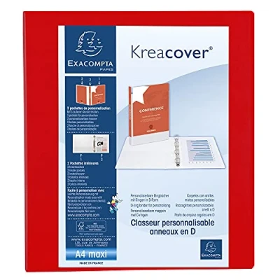 Rigid exterior in welded PP - Thickness 23/10th - 1 transparent A4 maxi pocket to personalize the front, back and back of the binder. As a bonus, the binder has 2 inside pockets to store loose sheets FILING CAPACITY: up to 450 sheets of 80g paper MECHANICAL: 4 D-rings diameter 50 mm - Back 75 mm for perfect alignment of sheets and inserts FORMAT: 320 x 295 mm - Format to file: A4 maxi, it adapts to all documents Easy to personalize with KREAMAN on the Exacompta website - Made in France - FSC certification Colours: red