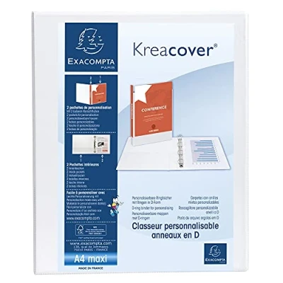 Rigid outside in welded PP - Thickness 19/10th - 2 transparent A4 maxi pockets to personalize the 1st cover and on the back FILING CAPACITY: between 230 and 270 sheets of 80g paper MECHANICAL: 2 D-rings diameter 25 mm - Back 47 mm for perfect alignment of sheets and inserts FORMAT: 320 x 277 mm - Format to file: A4 maxi, it adapts to all documents Easy to personalize with KREAMAN on the Exacompta website - Made in France - FSC certification Colours: white