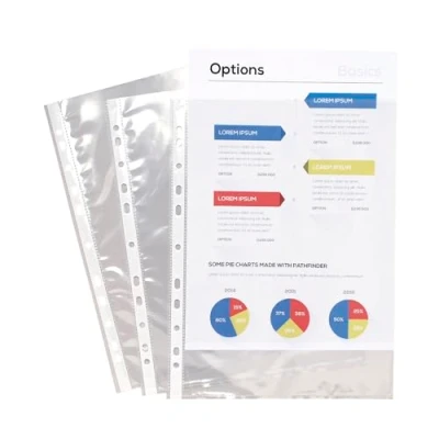 A4 in size Made from 0.06 mm clear Polypropylene Open at the top to insert documents Pre-punched left tab so it can be inserted into a file or folder Bag of 50
