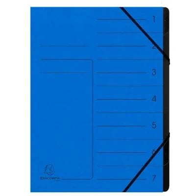 Highly functional staple back sorter made from noble materials: real glossy card for the cover and recycled card for the interior Cover: genuine glossy card 355 g/m2 – inside assembled by stapling in recycled card 170 g/m2 black CLOSURE: with elastic bands Printed WINDOWS NUMBER OF COMPARTMENTS: 7 - Capacity up to 350 sheets of 80g - Colour: Blue