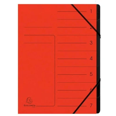 Highly functional staple back sorter made from noble materials: real glossy card for the cover and recycled card for the interior Cover: genuine glossy card 355 g/m2 – inside assembled by stapling in recycled card 170 g/m2 black CLOSURE: with elastic bands Printed WINDOWS Number of compartments: 7 – capacity up to 350 sheets of 80 g. Colour: red