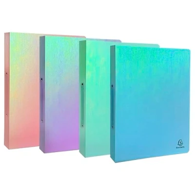 Candy Tidy - pop and shiny colours. Its dazzling holographic effect catches light and adds a touch of magic to your day Mechanical: 2 round rings diameter 30 mm - Spine 4 cm - Simple opening allows you to store up to 275 sheets of 80 g paper, including loose sheets, perforated pockets and dividers Size: 32 x 27 cm. File format: A4 (29.7 x 21 cm) and A4 maxi (29.7 x 24.2 cm). It fits all documents Material: semi-rigid polypropylene exterior 7/10th thickness - A binder that resists multiple handling Made in France – Sold in cardboard of 10 binders – 4 assorted colours: Azure, mint, parma, peach