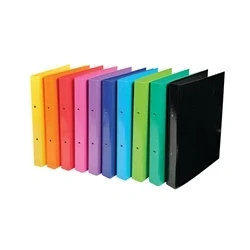 Bright coloured A4 ring binders. Standard 2 O-ring mechanism. 30mm filing capacity for up to 250 sheets of 80gsm paper. Rigid pressboard with a water resistant plastic coating. Size: A4.