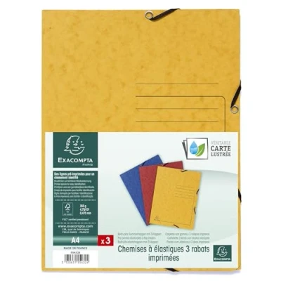 PRINTED SHIRT 3 Flaps with elastic bands - Printed on the cover for easy identification of contents Cover: genuine glossy 355 g/m2 card, a card of unique quality, homogeneous and tinted, without varnish or the addition of plastics; flexible card, suitable for small filing capacities Filing capacity: 250 sheets of 80 g approx DIMENSIONS: 24 x 32 cm - format to be classified: A4 - 100% French manufacture from raw material to finished product in our Exacompta factories - Clairefontaine ASSORTED COLORS: blue, yellow, red