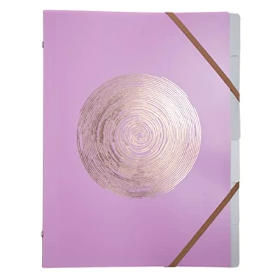 Ellipse sorter with 3 flaps to store loose sheets and provide additional filing capacity – the Ellipse range to see life in pink, decorative colours, enhanced with a rose gold graphic Cover: 5/10th recycled polyproplylene with rose gold stamping Interior: recycled polypropylene grey 3/10th translucent Compartments: 6 - Capacity: 180 sheets of 80 g Dimensions: 25 x 32 cm for A4 - random colours: grey, celadon green or rose gold